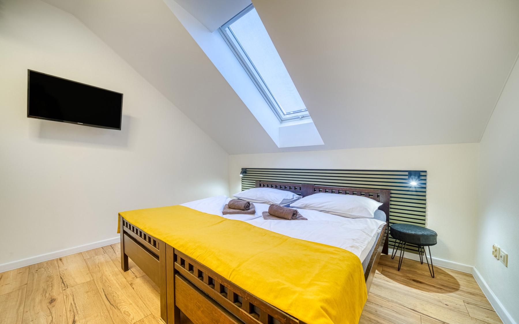 Izba je vybavená manželskou posteľou bez možnosti prístelky. Ponúka možnosť rozdelenia postele na 2 samostatné lôžka.